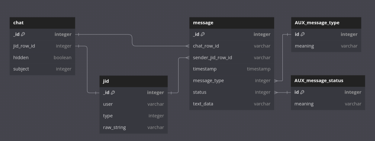: this table contains all the data about a message you would think of; the ID of its sender, the ID of the conversation into which the message was exchanged, its type (text, image, video, voice note etc.), its read status (has it been read from the other party, just delivered to them, or just delivered to the server), if it is a starred message, the timestamps of when it was sent and when it was delivered.- important columns for this query: